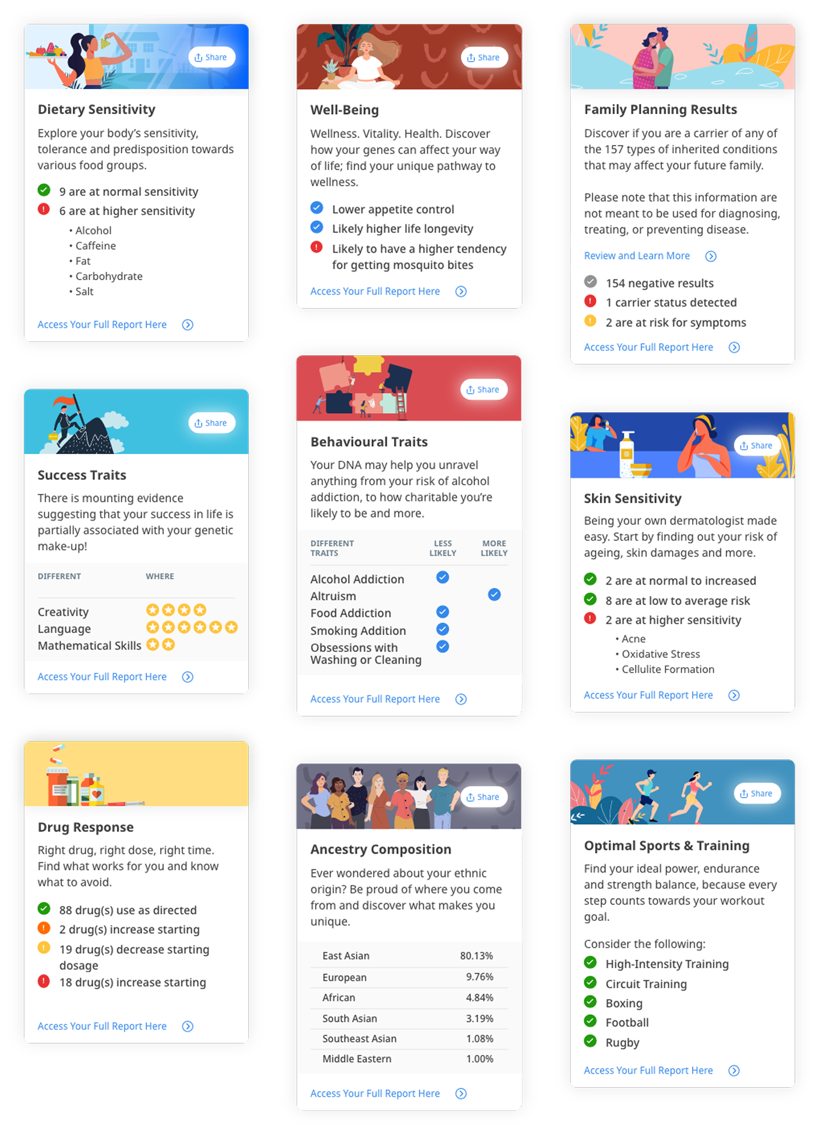 The Premium plan contains 20 categories. Each category will have one corresponding card summary in the report summary page. This will include the clinical reports such as disease risks as this information that won’t be viable to share on social media.