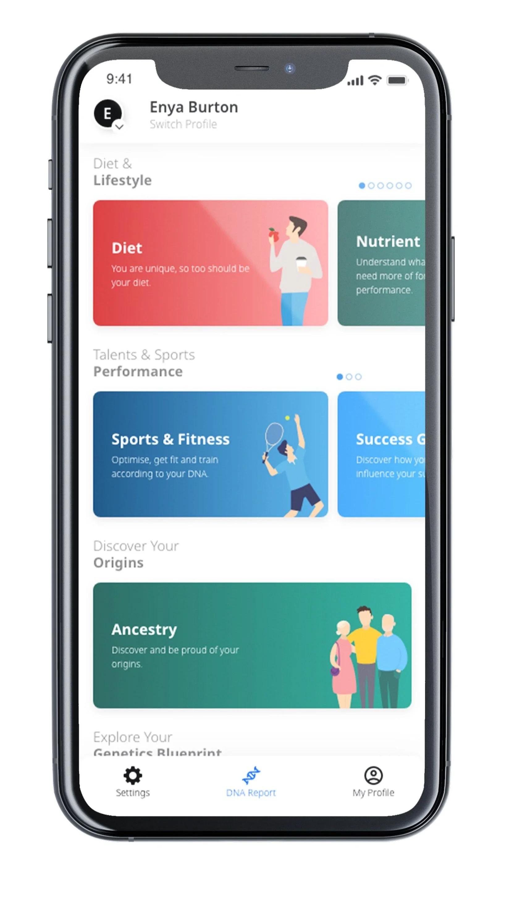 A bottom navigation has been added for fast access to the settings page, dashboard (DNA report) and profile page.