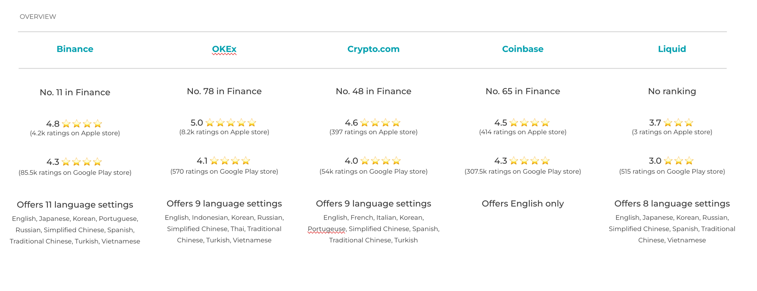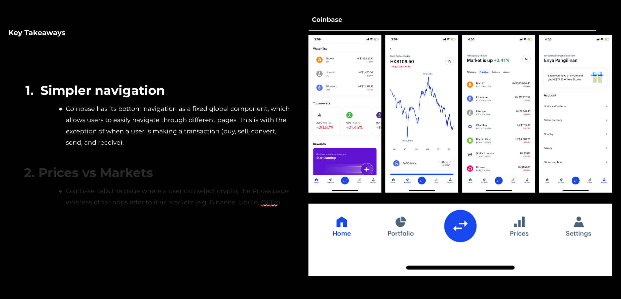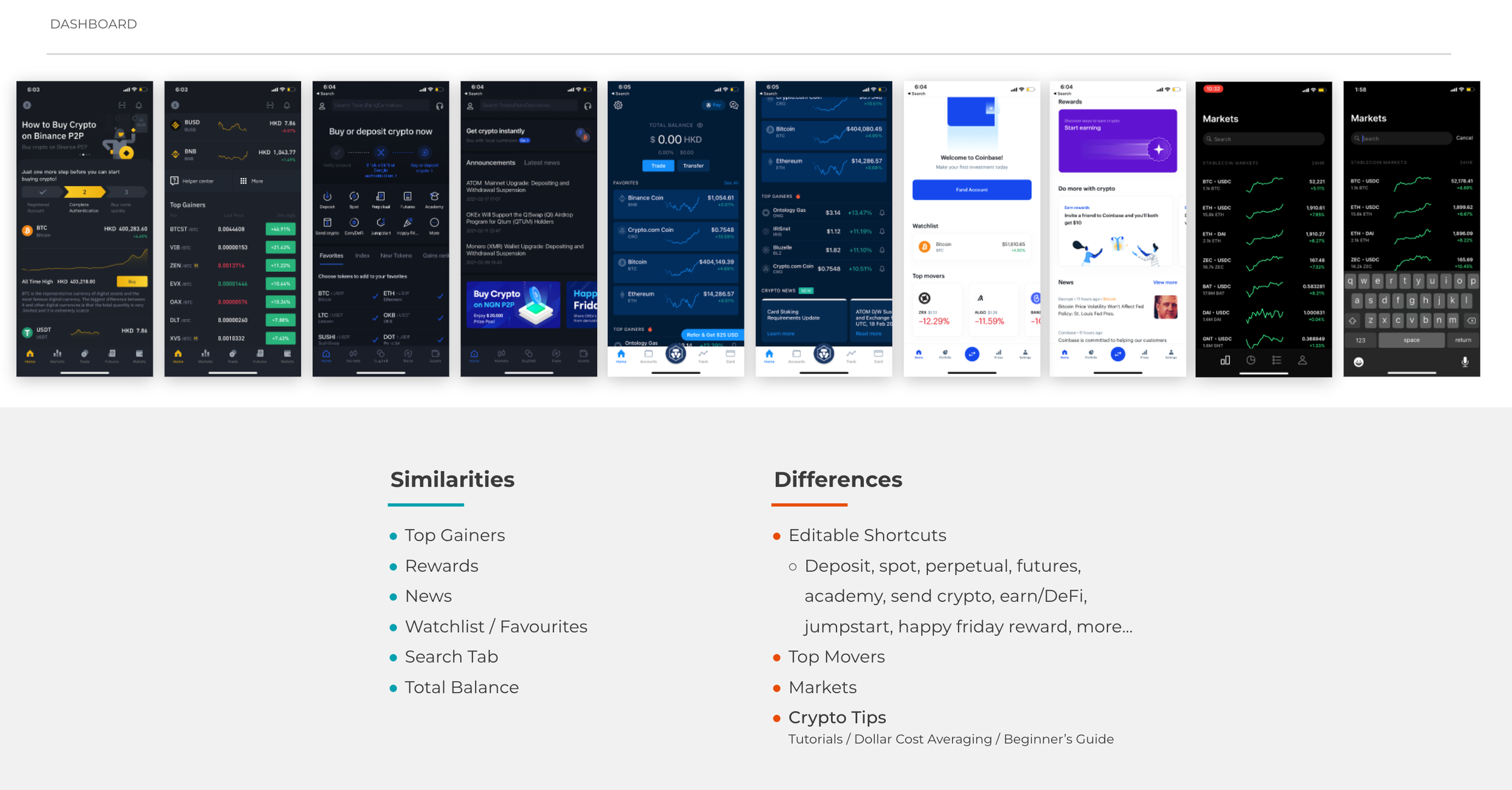Starting off, I conducted competitor analysis on various crypto apps, specifically apps that have both Lite and Pro modes within the same app or are separate app versions. In addition, I also looked into apps that are retail focused. The apps I researched on are: Binance, Crypto.com, Coinbase, Kraken, Liquid, and OKEX. I cross-examined their: