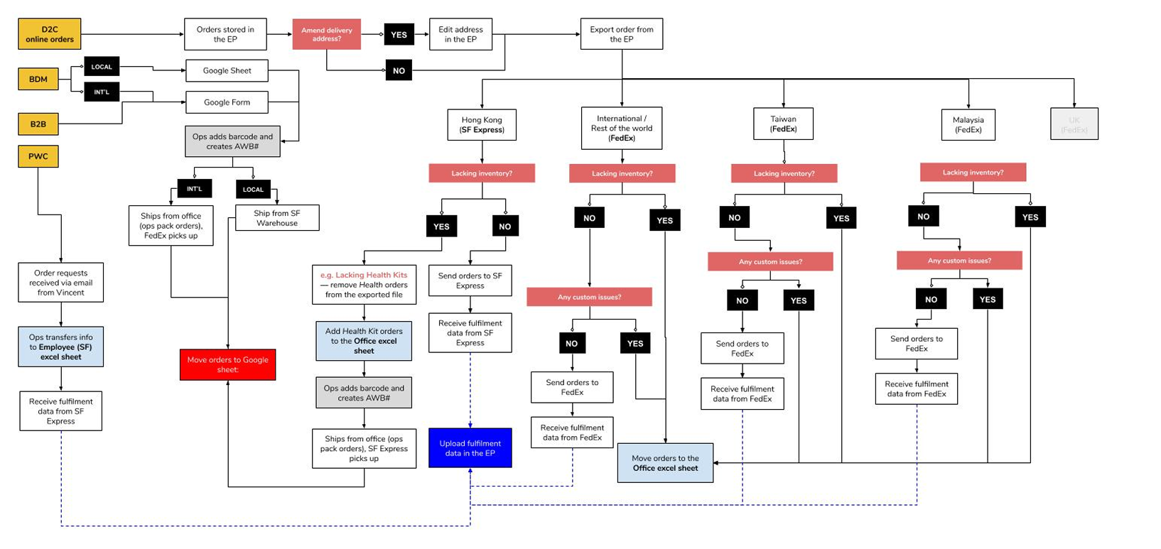 The best approach was to build a preset mechanism that allows customisation and filtering in order for the Ops team to export the offline order requests for the day in the same format as the order request exported from the portal. On the portal, they can easily manage the pain points. These are highlighted in pink on the user flow map above.